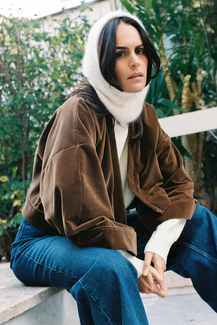Short and structured, BRADY reinvents the kimono in a cropped version with a clean drape. Handmade in Paris from 100% cotton velvet in a coffee brown color, it combines softness, character, and practicality thanks to its integrated pockets.